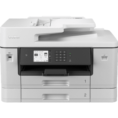 Print posters en banners op A3 formaat met de Brother MFC-J5730DW all-in-one. Win tijd door automatisch dubbelzijdig te scannen en kopiëren. Je netwerkbeheerder ontvangt mailtjes van de printer zodra het papier of de cartridge bijna op is. Zo zorg je ervoor dat je printer altijd te gebruiken is. Gebruik het 9,3 cm grote kleuren touchscherm om print- of scaninstellingen aan te passen zonder tussenkomst van je pc. Maak direct verbinding met de printer dankzij wifi direct en stuur je printjes op korte afstand. Hierdoor druk je toch je printjes af zonder in te loggen op het wifi netwerk. Bespaar papier door dubbelzijdig te printen. En met twee papierladen van ieder 250 vellen vul je minder vaak papier bij.